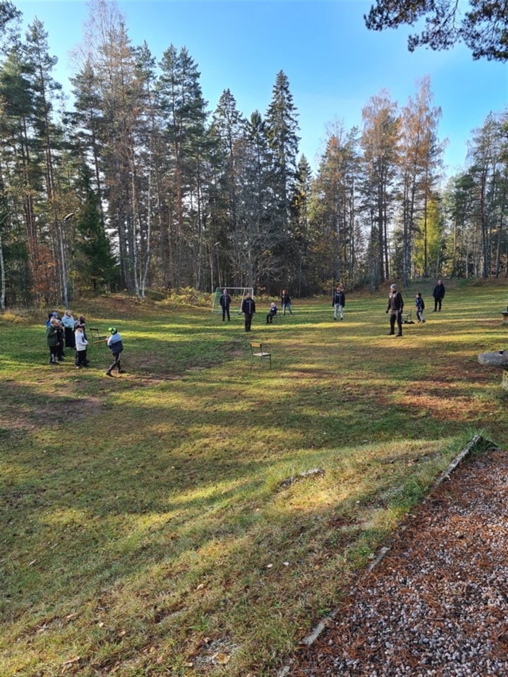 Barnen fick även utifrån sin gruppindelning leta reda på en pinne där alla kunde hålla i den samtidigt. Dom fick gå en slinga i skogen och utföra vissa moment medans alla skulle hålla kvar i pinnen. Först genom att man fick prata med varandra och sedan övergå till att alla skulle vara tysta och då kommunicera med tecken och kroppsspråk.