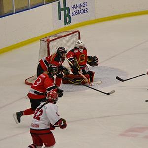 Efter en första period där vi inte riktigt kliver fram för att ta initiativ (avvaktande spel från vår sida) spelar vi ändå jämt med Södertälje och skottstatistiken slutar 11-11 med 0-0 på resultattavlan i periodpaus. Alla gör sitt jobb men de som klarar sitt uppdarg bäst är vår defensiva uppställning som håller 0:an.