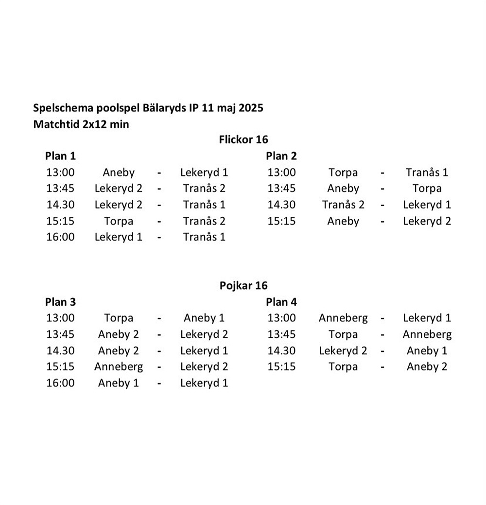 Här kommer information och spelschema till poolspelet nu på söndag 11/5 på Tallåsens IP, Bälaryd.