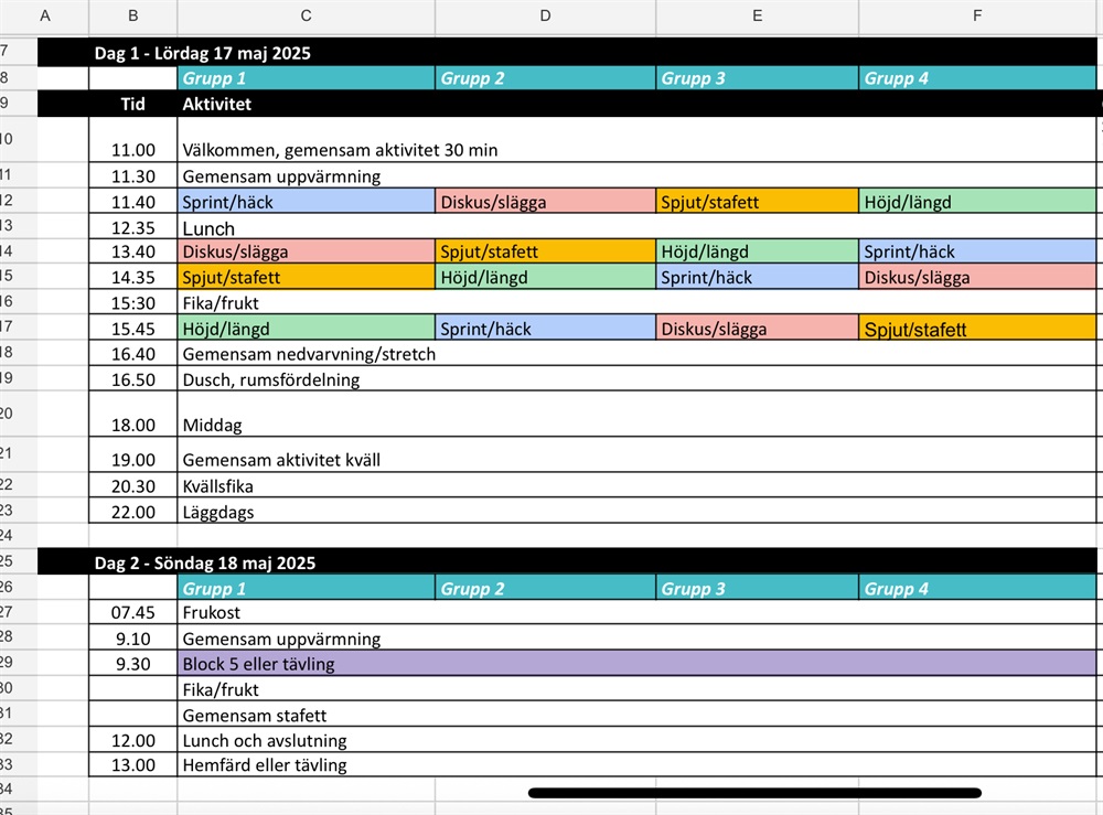 Packningslista · Träningskläder och tävlingskläder (kläder efter väder) · Träningsskor + spikskor/kastskor (man tar de skor man brukar använda) · Vanliga kläder · Vattenflaska · Keps/solglasögon/solskydd (om vädret är på vår sida) · Regnkläder (om vädret inte är på vår sida regnjacka/byxa) · Luftmadrass, kudde och sängkläder/sovsäck · Handduk och hygienartiklar (undvik starka dofter) · Mobil och laddare · Lördagsgodis/snack (till ett värde av max 50kr) – Obs! Inga nötter! Inför uppstart på lördagen kommer alla ombytta till träningskläder.