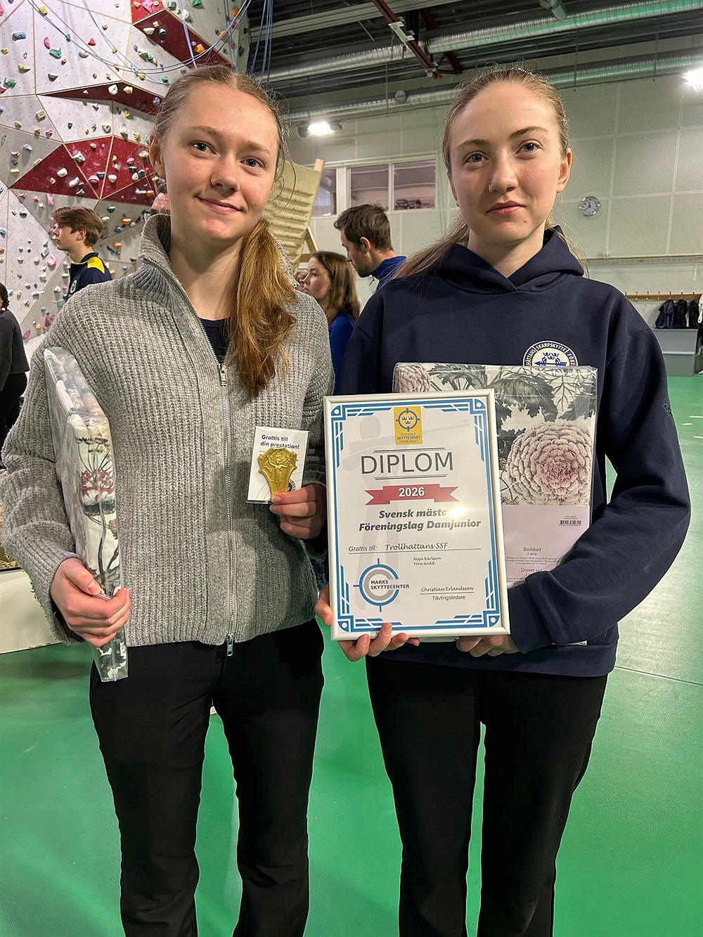 I helgen har SM och JSM gått av stapeln i Kinna hos Marks skytteförening. Och vilken tävling det blev, framförallt för Maja Karlsson som sköt hem ett SM-brons i damklassen under lördagen! Med personligt rekord i grundomgången (621,1) blev det en 7:e plats som tog Maja till final där hon även där gjorde ett toppenskytte och blev 3:a. Maja var otroligt nöjd och glad med sin tävling. Under lördagen sköt även Angelica Andersson 612.2, även det en ganska nöjd skytt, och Hanna Gadd fick som vanligt denna säsong det inte riktigt att stämma och fick 597.9. Sedan blev det söndag och Maja sköt igen, nu tillsammans med Vera Gadd. Vera öppnade knaggligt men avslutade med några riktigt höga serier och slutade 11:a på 615.4. Maja fick inte riktigt samma flyt som på lördagen men kämpade in 616.7 vilket gjorde att hon knep sista plats till final även denna dag! Som på lördagen var finalen jämn och Maja vandrade upp och ner i fältet och åkte till slut ut som 4:a. Värt att nämna är att för damjuniorerna krävdes det nästan 10 poäng mer än för herrjuniorer att ta sig till final, det finns så många bra damjuniorer just nu. Och Maja och Vera sköt till sig ett lagguld hem! Guldmedalj till klubben och diplom att sätta på väggen på Granngården resulterade det i! Det var pricken över i för en bra helg för Trollhättan. Samtidigt pågick även SM i viltmål 10 meter där våra klubbkompisar Peter och Jan-Erik Falk deltog för jaktskyttarna. De mötte svårt motstånd i landslagsskyttarna men det var kul att se dem skjuta. Och prova - tack för det!