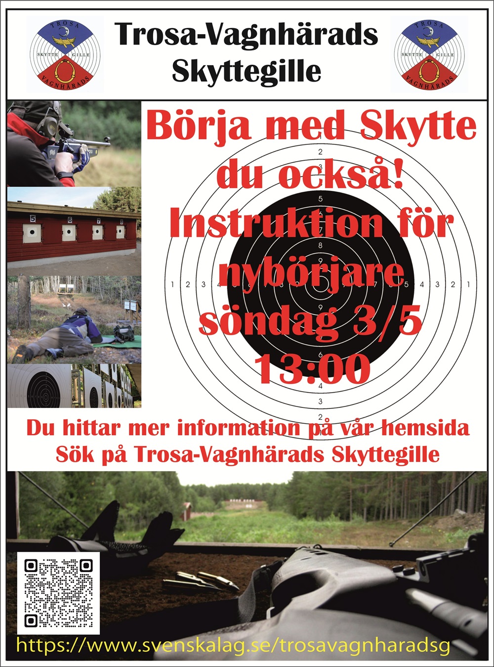 Söndag den 3:e maj kl 13:00 så är det en "Prova på dag" för nya skyttar vid skjutbanan. Det börjar med information om Trosa-Vagnhärads Skyttegille, våra aktiviteter, vapen och skytteteknik. Efter lite fika i klubbstugan så fortsätter vi med att skjuta några skott på vår korthållsbana. (50m samma vapentyp som vid skidskytte). Tag gärna med kompisar som vill prova på en rolig sport som fungerar för alla åldrar från 10 år och uppåt. Allt är gratis men maila gärna larhed6@gmail.com om du kommer eller har andra frågor så att vi vet hur mycket fika vi skall ordna. Se mer information på föreningens hemsida: https://www.svenskalag.se/trosavagnharadsg Här hittar du även vägbeskrivning till skjutbanan och annan information om föreningen. Om du blir intresserad av att fortsätta så finns det många skjutningar framöver där man snabbt bygger upp sin skytteteknik och förbättrar sina resultat.
