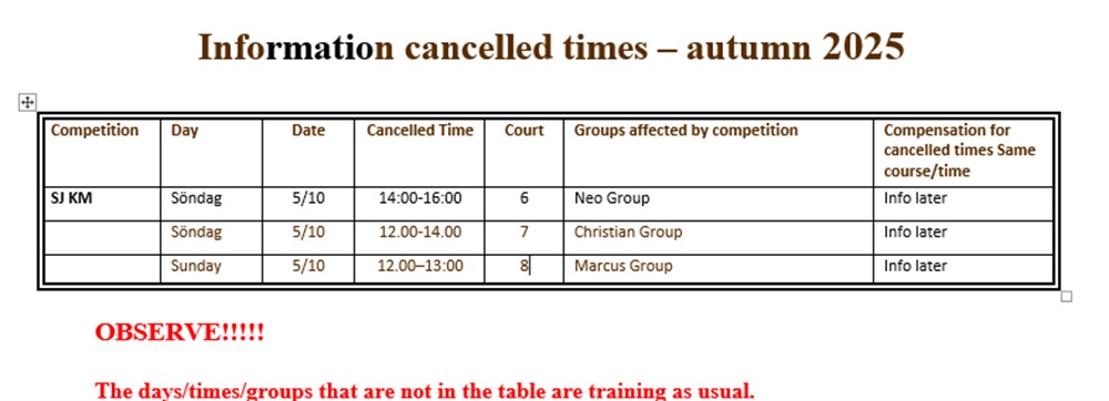 Höstterminens ordinarie träning slutar söndagen 14 december.
