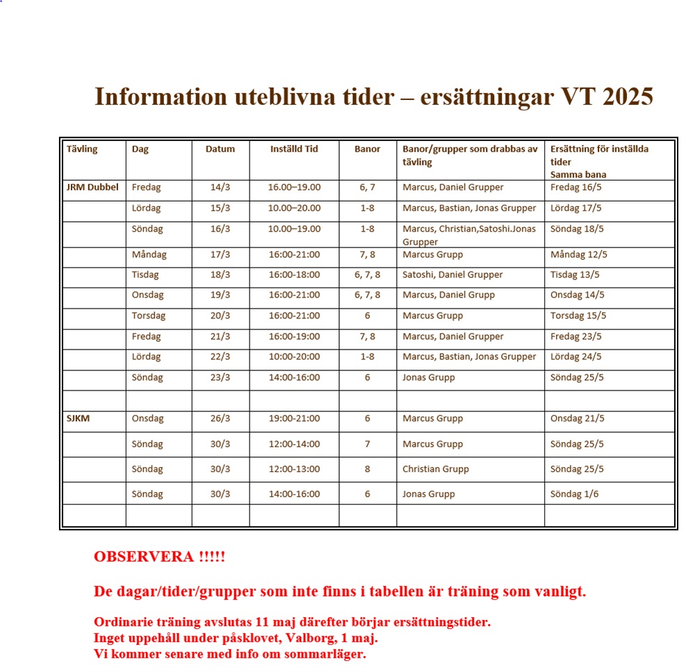 Kontrollera i tabellen ovan Information uteblivna tider – ersättningar VT 2025 vilka träningstider kommer att tas i anspråk för tävlingen.
