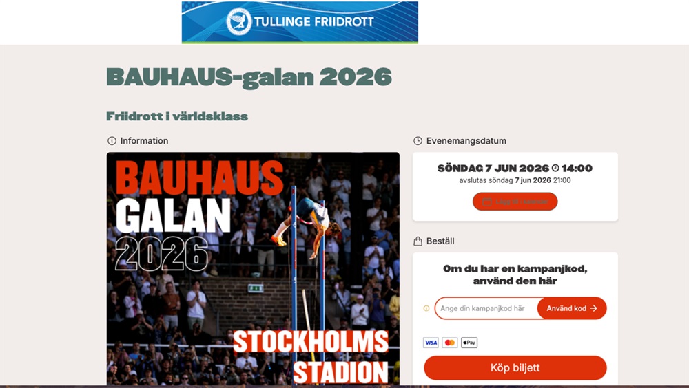 Tullinge friidrott kan erbjuda 20 procents rabatt på biljetterna! Du hittar köpsidan på denna länk: https://bauhausgalan.ticketco.events/se/sv/e/bauhausgalan_2026