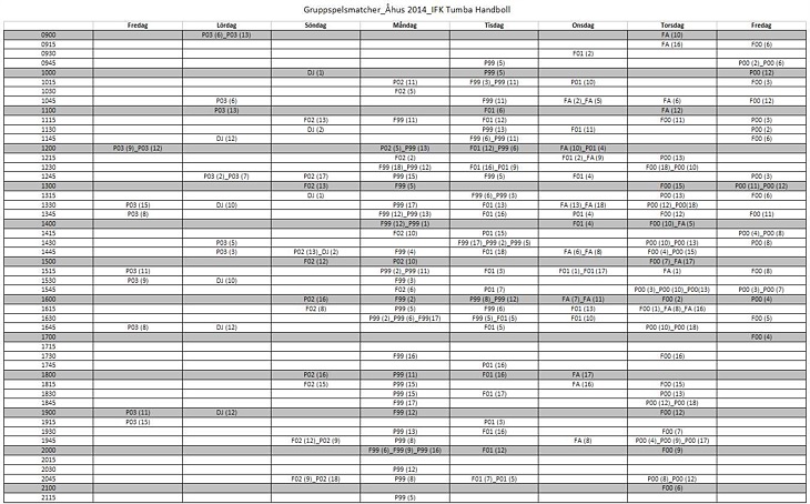 Som mest har vi tre lag som spelar samtidigt på olika planer men oftast är det ett lag i taget. Den längsta sammanhållna serien av matcher börjar på måndag 1445 och slutar först 1630, den snabba kan se åtta matcher i rad innan det är dags att köpa glass!