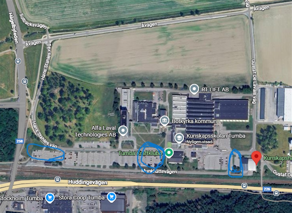 Parkera vid Kunskapshallen under Tumbaspelen kan du göra vid någon av de tre markerad områdena. Precis nedanför kortsidan på Kunskapshallen, vid Tumba Kraftklubb finns 3 timmars fri parkering, därefter Easypark och längre bort finns fria infartsparkeringar.