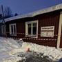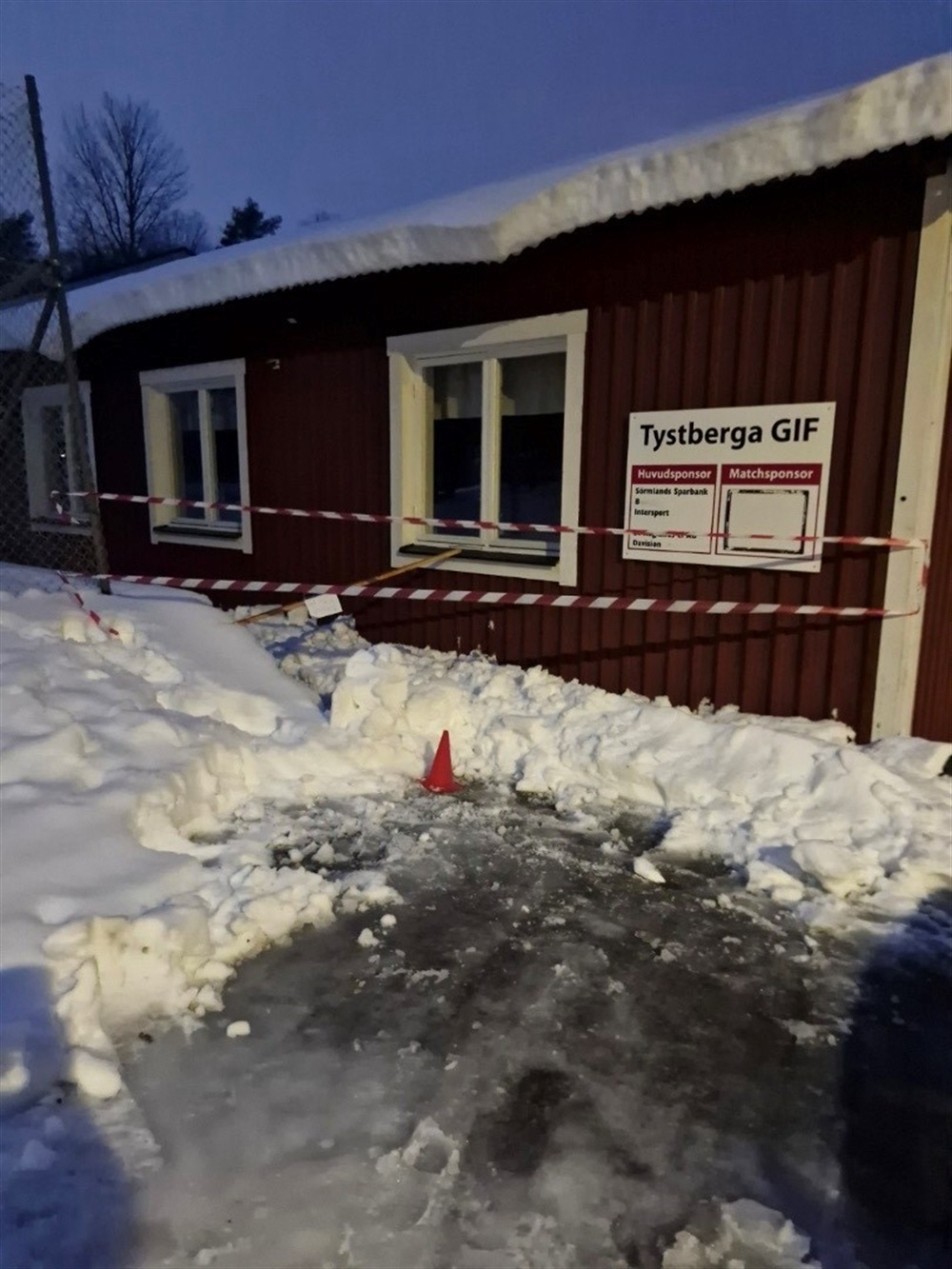 Varning för snöras vid ingången till gymmet. Gå runt tennisplanen så att inga olyckor sker!