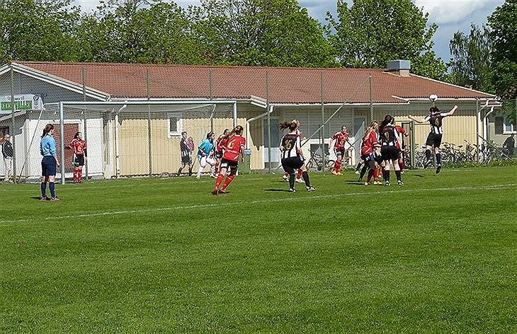 I andra halvlek förändras matchbilden, vi får vinden och solen i ryggen, vi börjar slå lite längre bollar och fick flera frilägen. I 50 min jobbar Evelina fram en hörna. Madde slår den och Sigrid möter bollen fint med pannan, bollen går i en båge över målvakten in i mål, 1-0. I 65 min blir Cecilia skadad och blir tvungen att linka av, vi hoppas på en snar återhämtning. Efter det jagar vi fler mål och borde ha gjort minst två till innan Blom gör 2-0 i 75 min fint framspelad av Alda. Här borde matchen varit avgjord men istället reducerar Rosersberg bara minuten senare. På en tilltrasslad situation lyckas vi inte rensa bollen, istället hamnar den framför fötterna på deras spelare som slår in bollen i mål, 1-2 och nu börjar nervositeten sprida sig. Rosersberg tryckte på men vi värjde oss och slutligen kunde vi gå segrande ur matchen.