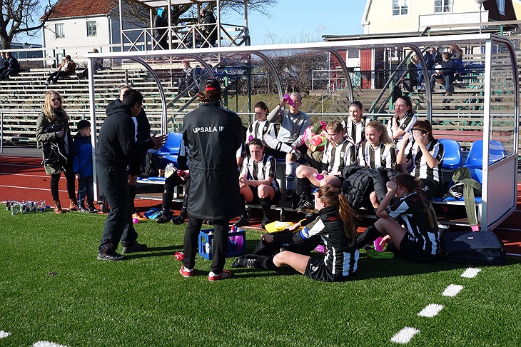 Andra halvleks första 10 minuter äger GUSK fullständigt och Christofer bestämmer sig då för att ta vår första bonusstraff. Anna S, som enligt mig var planens gigant tillsammans med Madde, kliver fram och sätter 2-1 säkert 57e i minuten. Vilken matchändring det blev efter det! UIF styrde matchen och GUSK hade svårt att ta sig över planhalvan. I 75 minuten tar UIF ut sin andra bonusstraff men bommar och får hörna istället. Madde slår hörnan perfekt och Anna J möter den på volley och vinklar in den. 3-1 och vi styr och ställer på plan med vår höga press som GUSK inte förmår att spela sig ur. Men från ingenstans dimper ett onödigt mål in bakom Malin och spetsar till slutminuterna. Dock kan GUSK inte vända sitt underläge och UIF har sin andra vinst i cupen. 3-2 är inget orättvist resultat. Styrkan idag låg i att när vi spelade som sämst tog fram kämpaglöden istället. Många gjorde bra insatser förutom de två som jag nämnde ovan så gjorde Malin några riktigt vassa räddningar och några fick spela på flera olika positioner och gjorde det mycket bra.