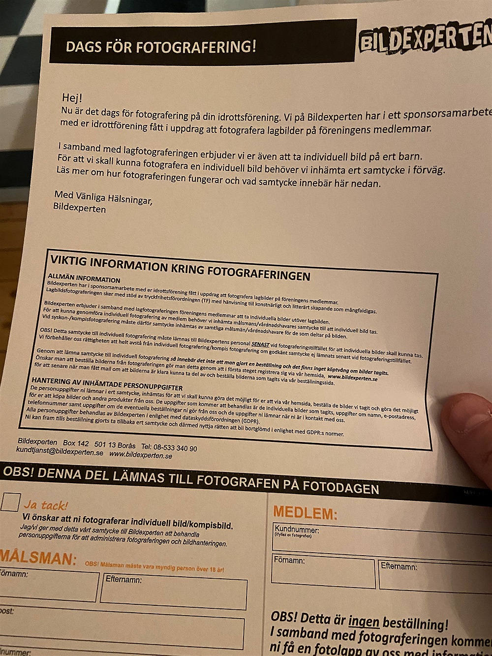 Om man vill vara med på lagfotograferingen så behöver man ta med sig en lapp (se bilden ovan) och den ska vara undertecknad av en förälder eller annan målsman.