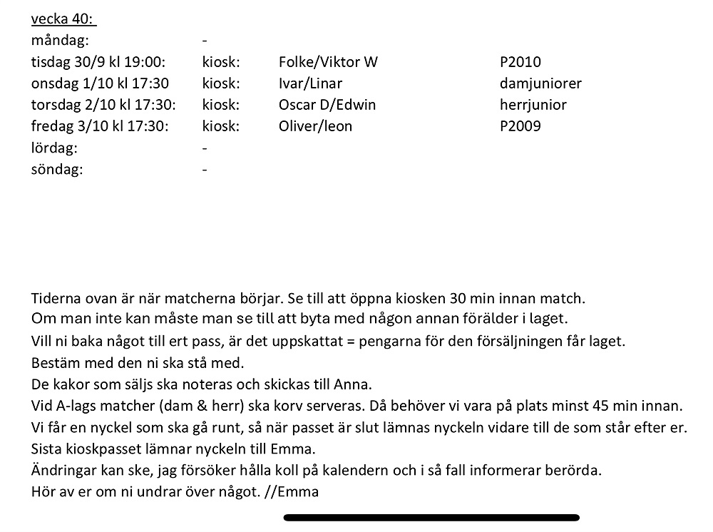 Ni kommer att få introduktion om vad ni ska hjälpa till med när ni kommer. Barnen bjuds på korv och dricka. Föräldrar bjuds på smörgås och kaffe. Arbetspassen slutar efter bingopausen är slut. Försäljningen sker utomhus.