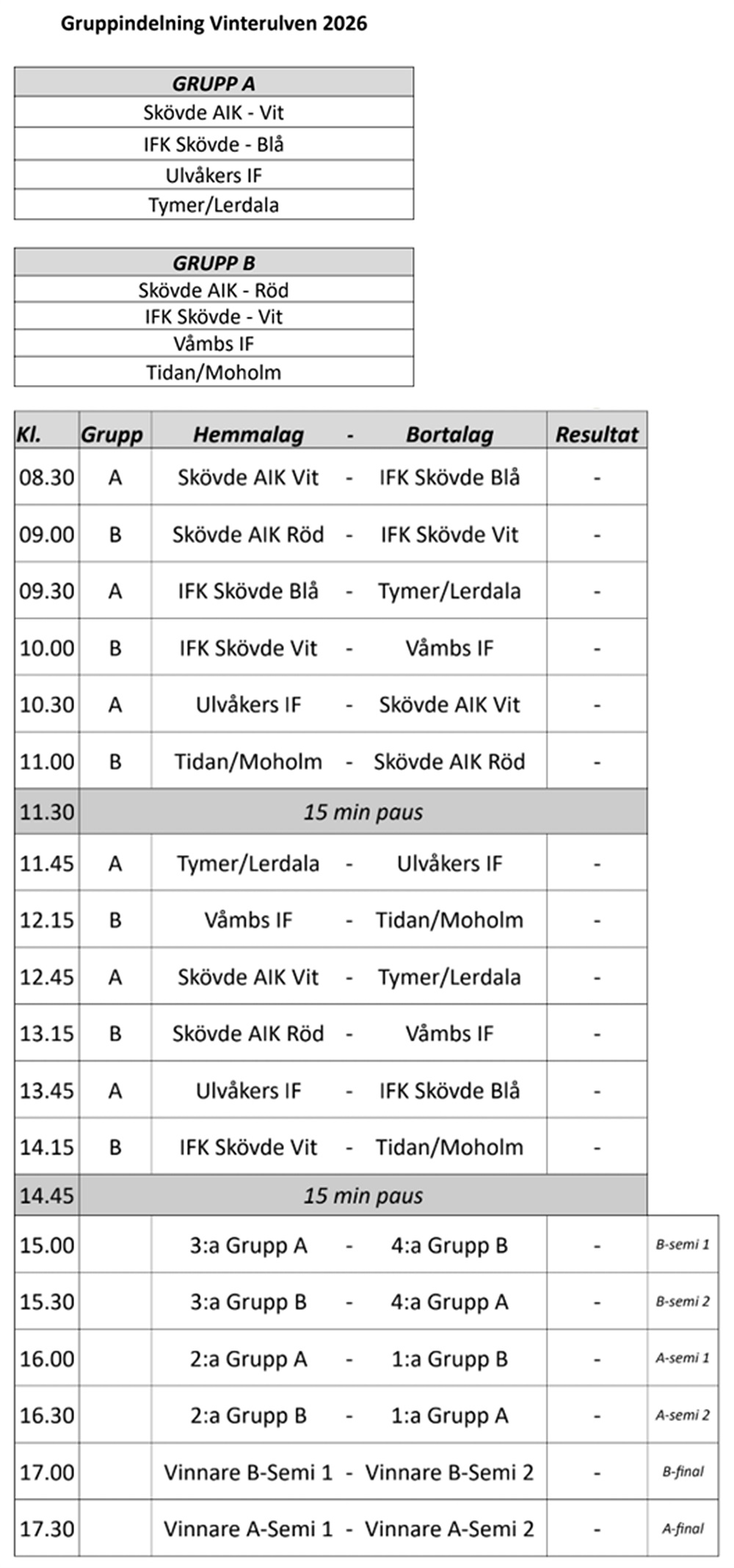 Här kommer spelschema och gruppindelning inför vinterulven den 11 april, kallelse har skickats ut.