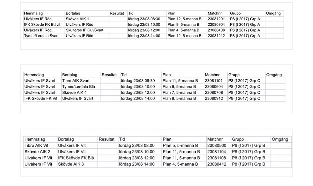 Alla lag samlas 30 minuter innan första matchen, framför Putteplan. (Lag vit 7.30, lag röd+svart 8.00). Av egen erfarenhet vet jag att det kan vara ett litet parkeringskaos denna dagen, så ta gärna med det i tidsberäkningen.