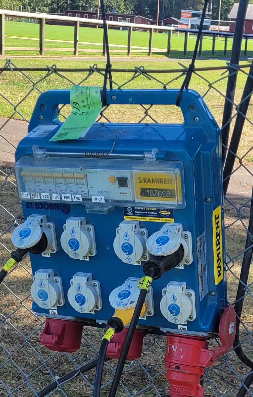 Strålkastarna tänds och släcks enklast via huvudbrytaren i elcentralen som hänger i staketet mellan A och C-plan.