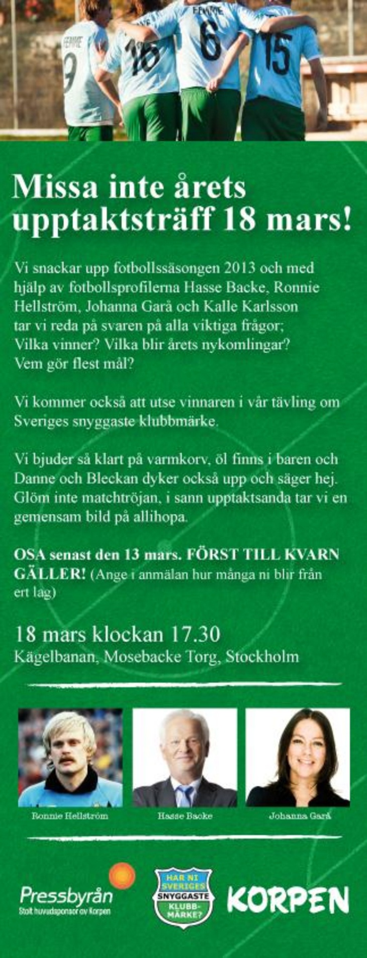 Ta chansen att träffa profiler som Ronnie Hellström, Johanna Garå och Hasse Backe som tillsammans med några av Sveriges bästa fotbollsjournalister kommer snacka upp korpsäsongen 2013. Korpen bjuder dessutom på korv och dricka!