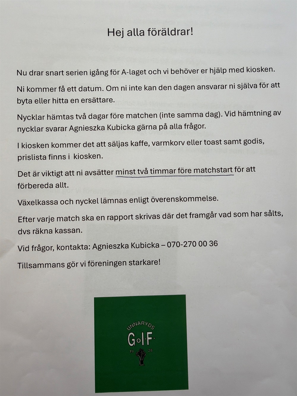 Hej! Styrelsen har tagit beslut på att ungdomslagen inte ska vara bollkallar längre, utan de ska hjälpa till i kiosken istället. Så tjejlaget har blivit tilldelade två hemmamatcher som vi behöver hjälp av två barn och föräldrar per match. Datumen det gäller är 29/5 och 7/7 matchstart är 19:00 båda matcherna, man ska vara på plats två timmar innan matchstart.