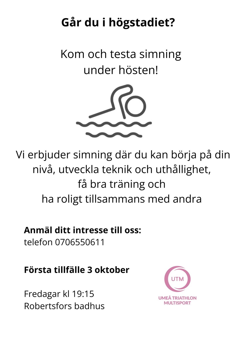 Du som går i högstadiet har möjlighet att simträna på fredagar. Oavsett nivå kan du utveckla dina simkunskaper, få bra träning och samtidigt ha roligt tillsammans med andra. Det spelar ingen roll om du är nybörjare eller redan kan simma många längder i bassängen – alla är välkomna att delta och lära sig mer.