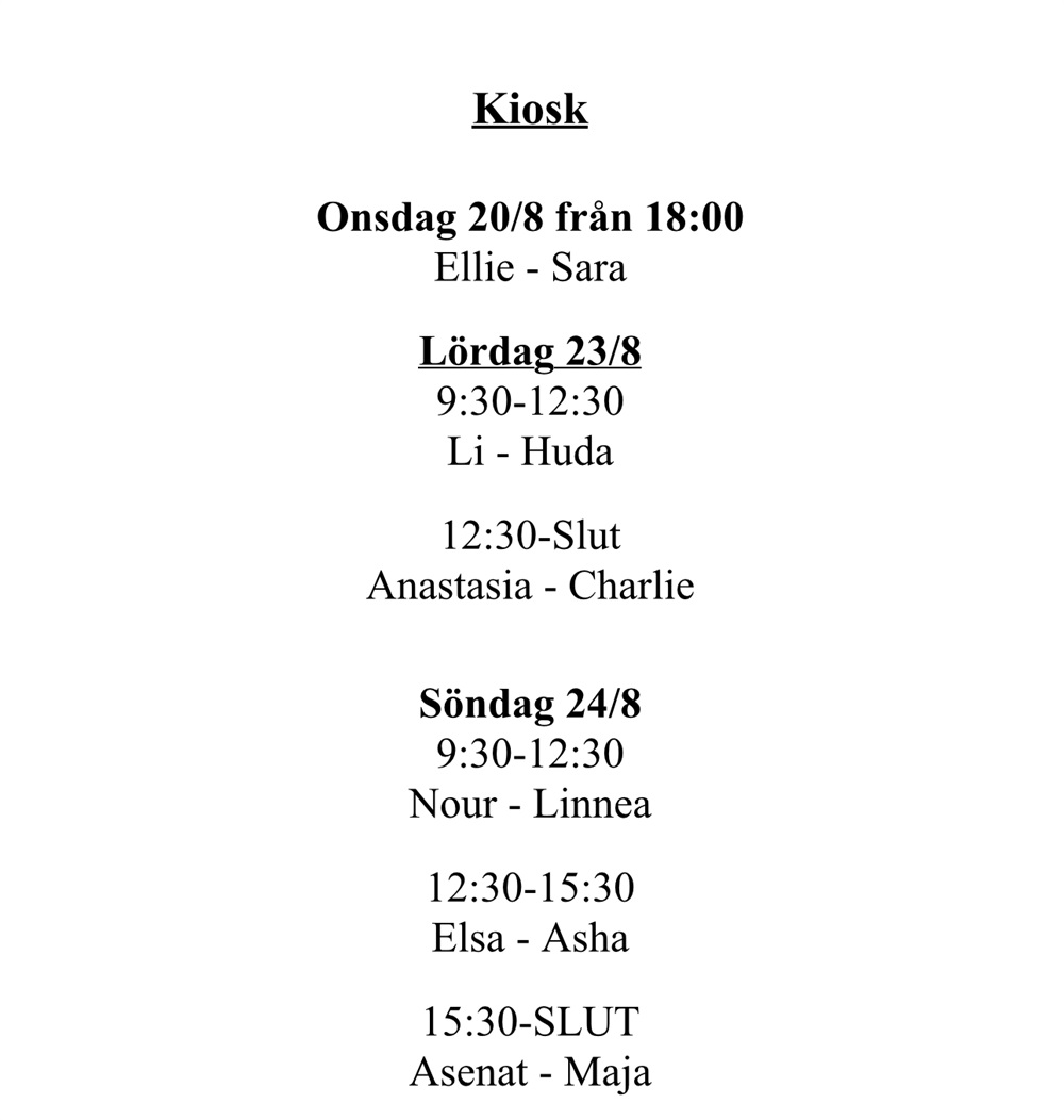 Höstens kiosktjänst för föräldrar är under vecka 34, se bild. Kan du ej på ditt pass får du kontakta någon i laget för att byta eller be om hjälp.