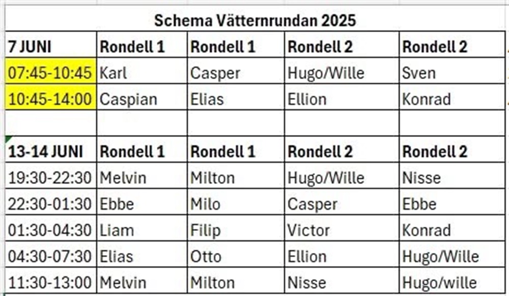 Hej Alla! Här kommer en uppdaterad lista för våra tider som gäller under dom två kommande helgerna. Återigen är det erat ansvar att er tid är bemannad. Den som har sista passet i sin rondell ser till att flaggor och västar kommer till de som ska stå nästa pass. Tänk på att det kan vara lite glapp mellan starttiderna. Det ska komma en följebil och meddela när sista cyklisten har passerat. Torsdag 8/6 kl 18.30 (under killarnas träning) kommer vi ha ett informationsmöte samt utdelning av t-shirtar och flaggor. Bra om så många som möjligt kan komma då, annars får ni hämta det hemma hos oss på Hökgatan 9.