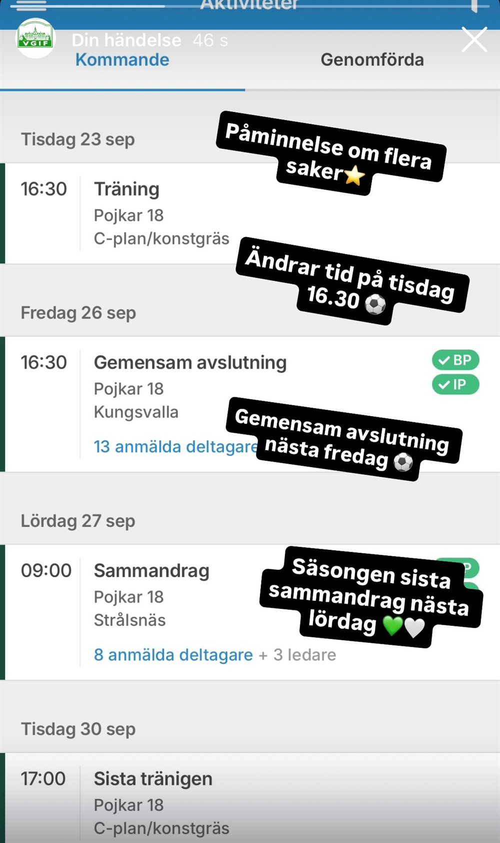 Välkomna till gemensam avslutning Fre 26 sep, 16:30-19:00 på Kungsvalla för hela föreningen ⚽️