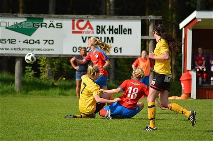 Vi tog också ledningen efter ett intensivt arbete framåt. En fin boll från Emma letade sig fram till Lolly som inte gjorde något misstag och fick in 1-0 i mål. Lättnaden som spred sig i laget var stor, kanske lite väl stor, då våra motståndare allt mer började äta sig in i matchen allt eftersom vi blev trötta av att hålla ett högt tempo. Kvittering och så småningom också ledningsmål 1-2 kom därför snabbt. Våra motståndare kunde i första läget utnyttja vår passivitet på en hörna och strax efteråt via ett välplacerat inspel fick de in bollen i mål än en gång. Vi fick därför gå till halvtid med ett måls underläge trots att känslan i laget var mycket positiv och det kändes som att vi hade koll på läget.