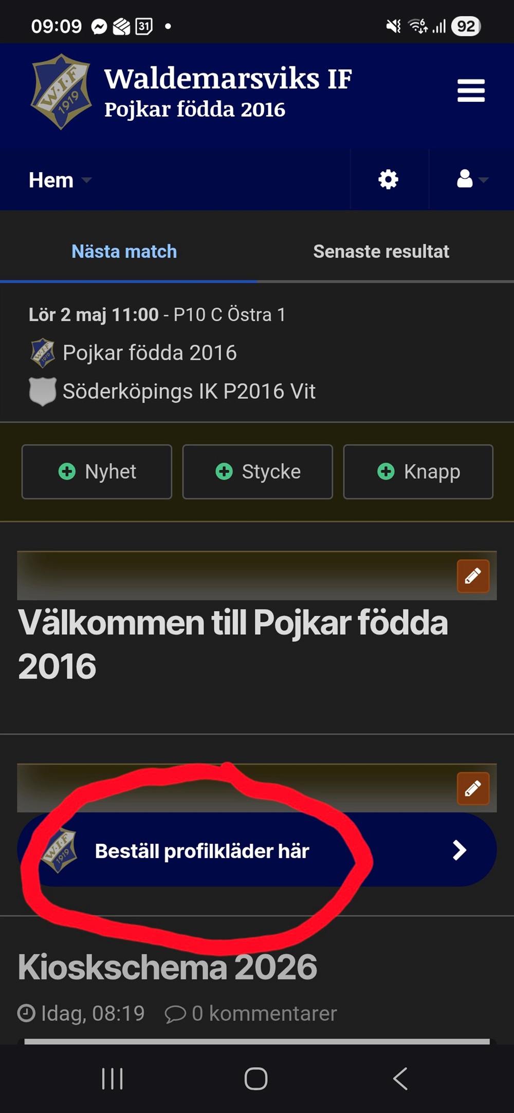 Om ni behöver beställa kläder, t.ex. nya shorts, så kan ni klicka på "den blå knappen" på vår profilsida. Då kommer ni till den sidan där vi kan beställa kläder. Tänk på att storlekarna är små. När ni är inne på sidan kan ni välja junior (upp till strl 164) eller senior (från strl xs).