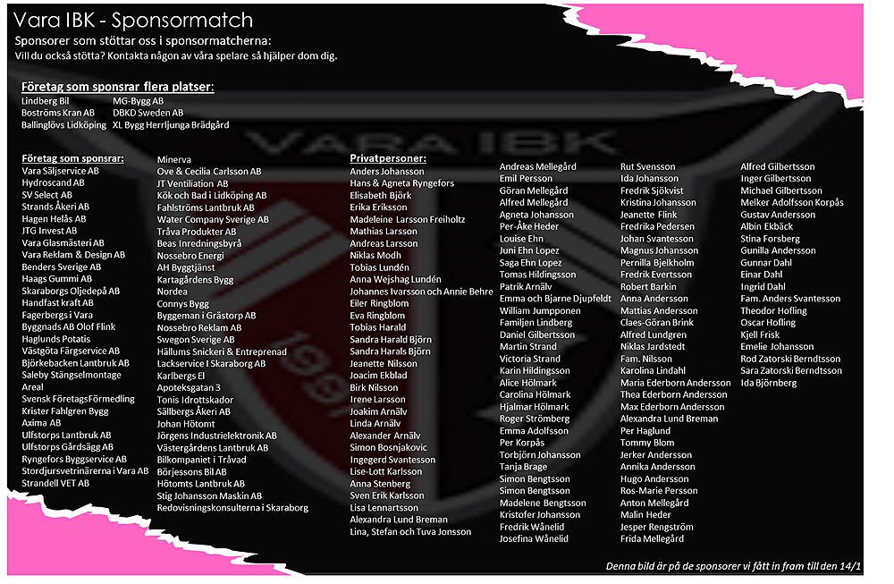 Innan jul så drog föreningen igång med försäljning av sponsormatch, vi har redan fått in flera som vill stötta oss i att finansiera en ny sarg till föreningen. Vill du också hjälpa till och stötta? Hör av dig till en spelare ifrån föreningen så hjälper de dig.