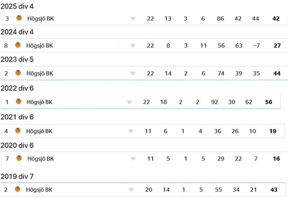 Högsjö BK är det ganska länge sedan vi spelade seriematcher mot. 1968 är senaste och då var det division 5 som gällde. Värt att notera är att division 5 då motsvarade 5e division. Division 4 motsvarar i dagsläget 6e division så 1968 var på en högre nivå om man räknar nivåer över.