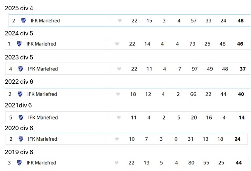 IFK Mariefred har vi inte stött på i seriespel på den här sidan 2000. Senaste mötet var i division 4 då var året 1994. IFK trillade ur fyran det året och vi spelade kvar. Fyran var då nivå 5 uppifrån räknat i år så är den nivå 6. IFK gjorde en stark säsong förra året och tog en kval plats. Där var övriga lag lite för starka Tabell och resultat - Södermanland
