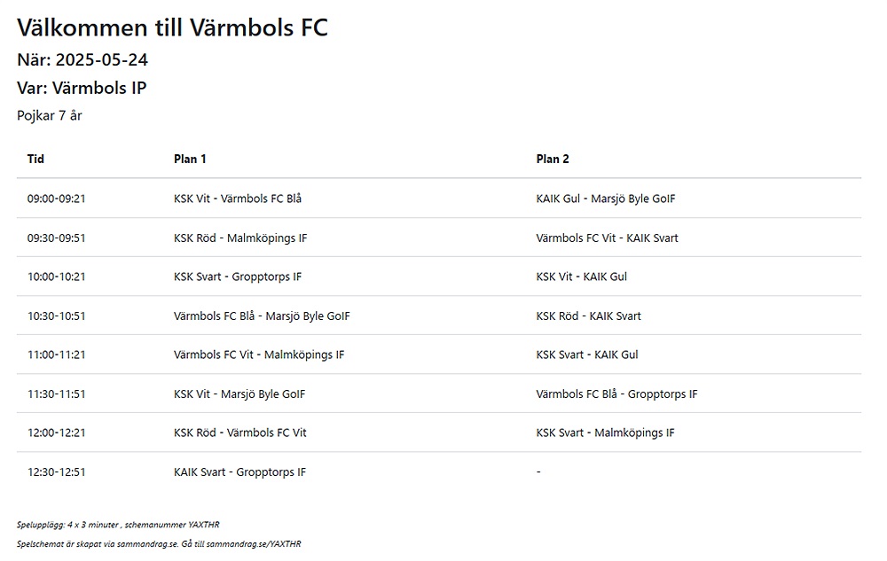 Här är spelschemat för det kommande sammandraget som hålls på Värmbols IP den 24/5.