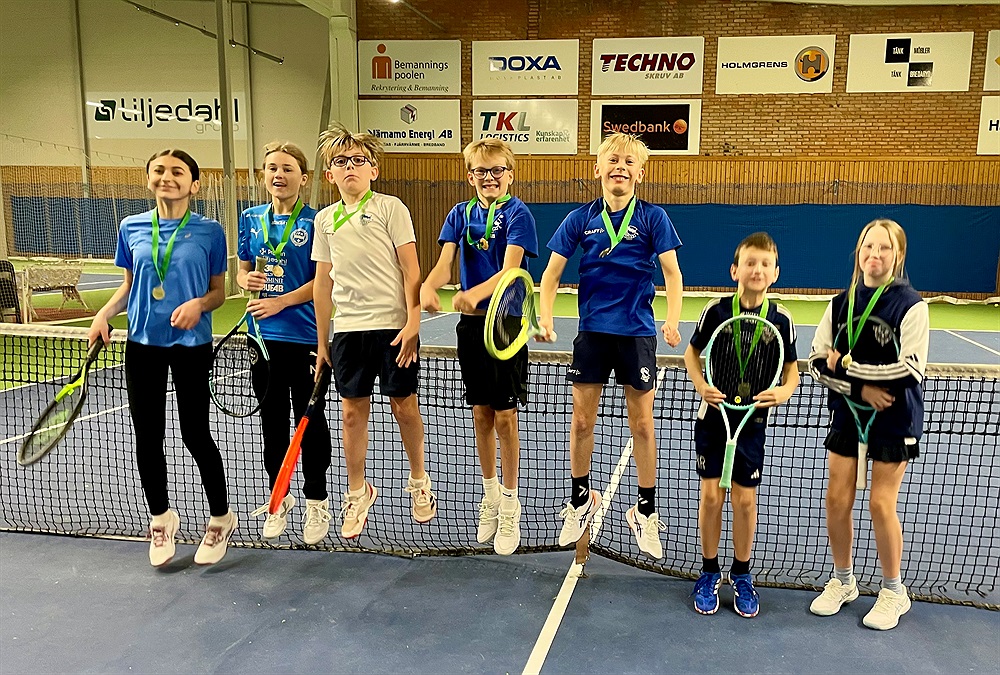 Från vänster i bild: Naya Alsaied Ali, Nellie Lindén, Gustav Mårtenson, Axel Danås och Julius Rudeberg, samtliga från Värnamo TK. Kian Radojicic och Minna Jyrkin från Tabergsdalens TK
