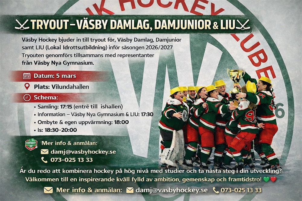 Den 5 mars öppnar Väsby Hockey dörrarna för nästa steg i vår satsning på damhockey. Vi bjuder in till tryout för vårt nystartade Damlag, våra Damjuniorer samt LIU (Lokal Idrottsutbildning) i nära samarbete med Väsby Nya Gymnasium.