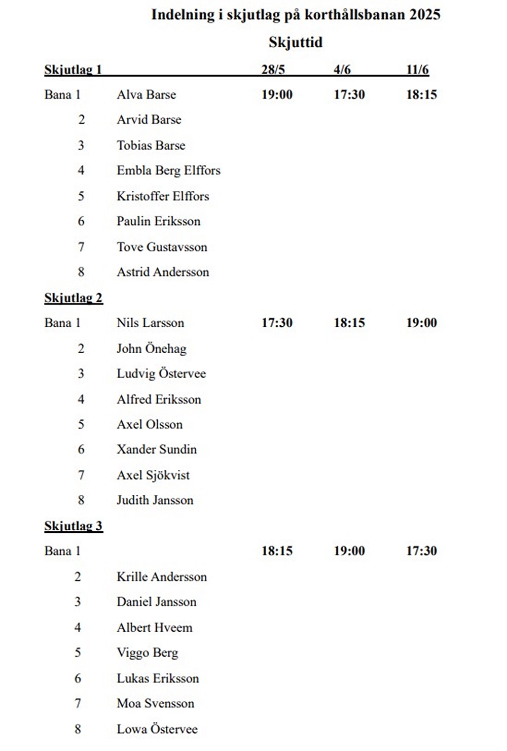 Uppdaterade skjutlag och skjuttider fram till terminsslutet.
