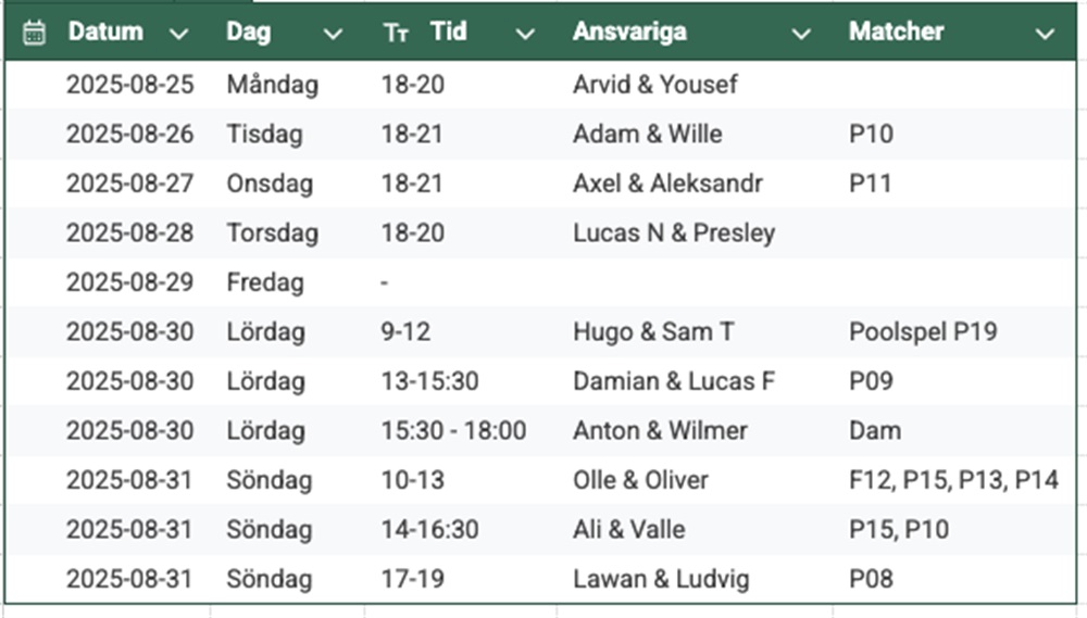 Vecka 35 är det vårt lags tur att bemanna kiosken vid Sportfältet. Jag har gjort ett schema (se bifogad bild) över vilka som ansvarar för kiosken respektive dag och tid. Tiderna som anges är när kiosken ska ha öppet, så kom i god tid och förbered. I samband med matcher ska kiosken hållas öppen till ca 30 minuter efter matchens slut.