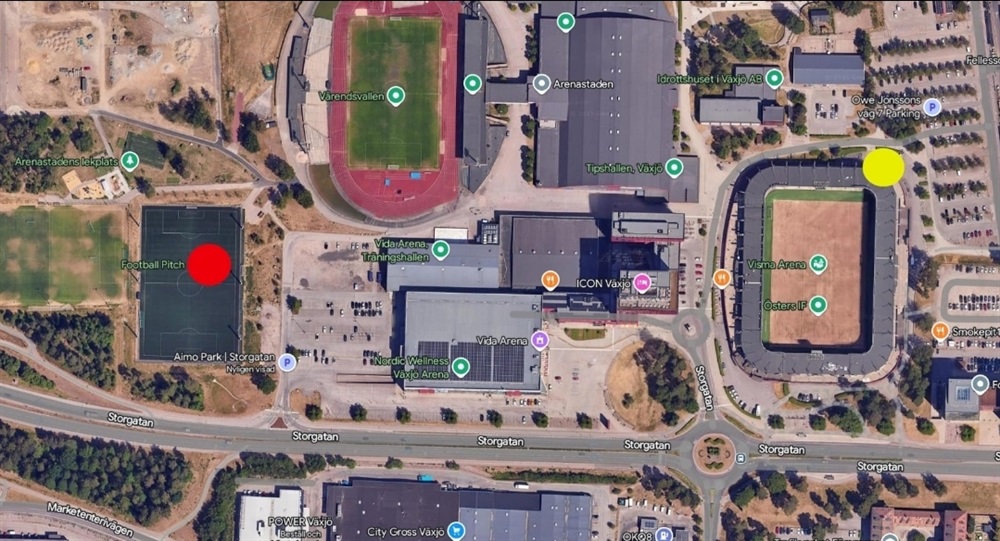 Vi samlas kl. 08.30 vid Visma Arena, på nordöstra hörnet (se bifogad bild), för att byta om till matchkläder. När alla har bytt om delar vi in barnen i fyra lag och går tillsammans i samlad trupp till konstgräsplanen bakom Vida Arena.
