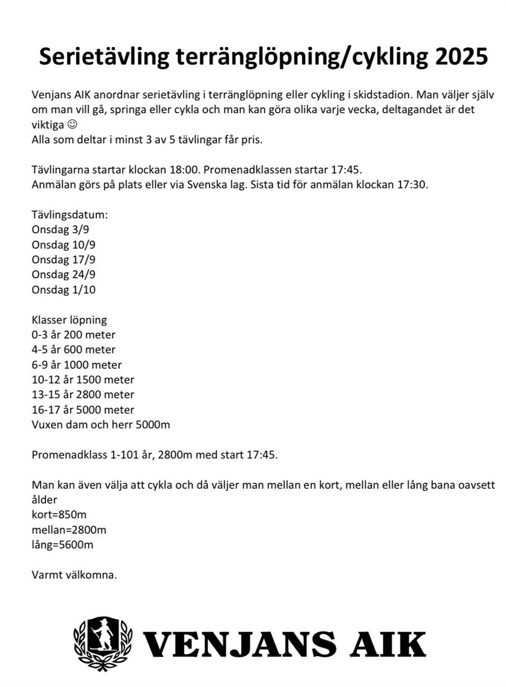 Nu under hösten tar vi upp en klädbeställning av Venjans AIKs klubbkläder. Det gäller skidor, löpning, cykel, pikétröja samt överdragskläder/overall. Provkläder finns en begränsad tid på Venjans gym. Kontakta Lina för tillfällig kod till gymmet, 070-6162937. Även beställningslista finns på gymmet.