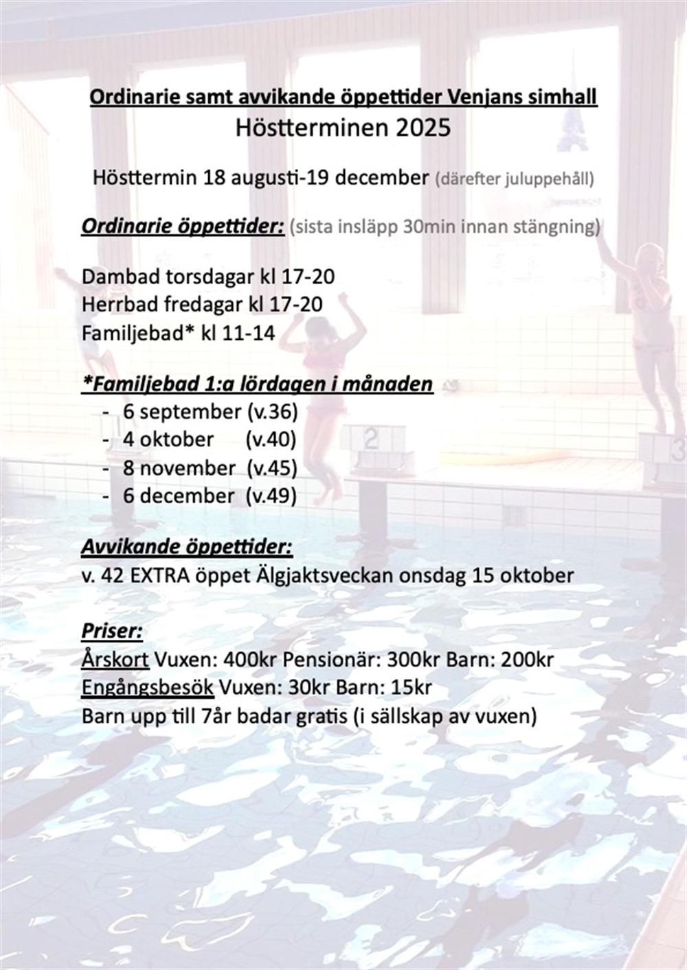 Vi har en liten men jättefin simhall i Venjan med bassäng och bastu.