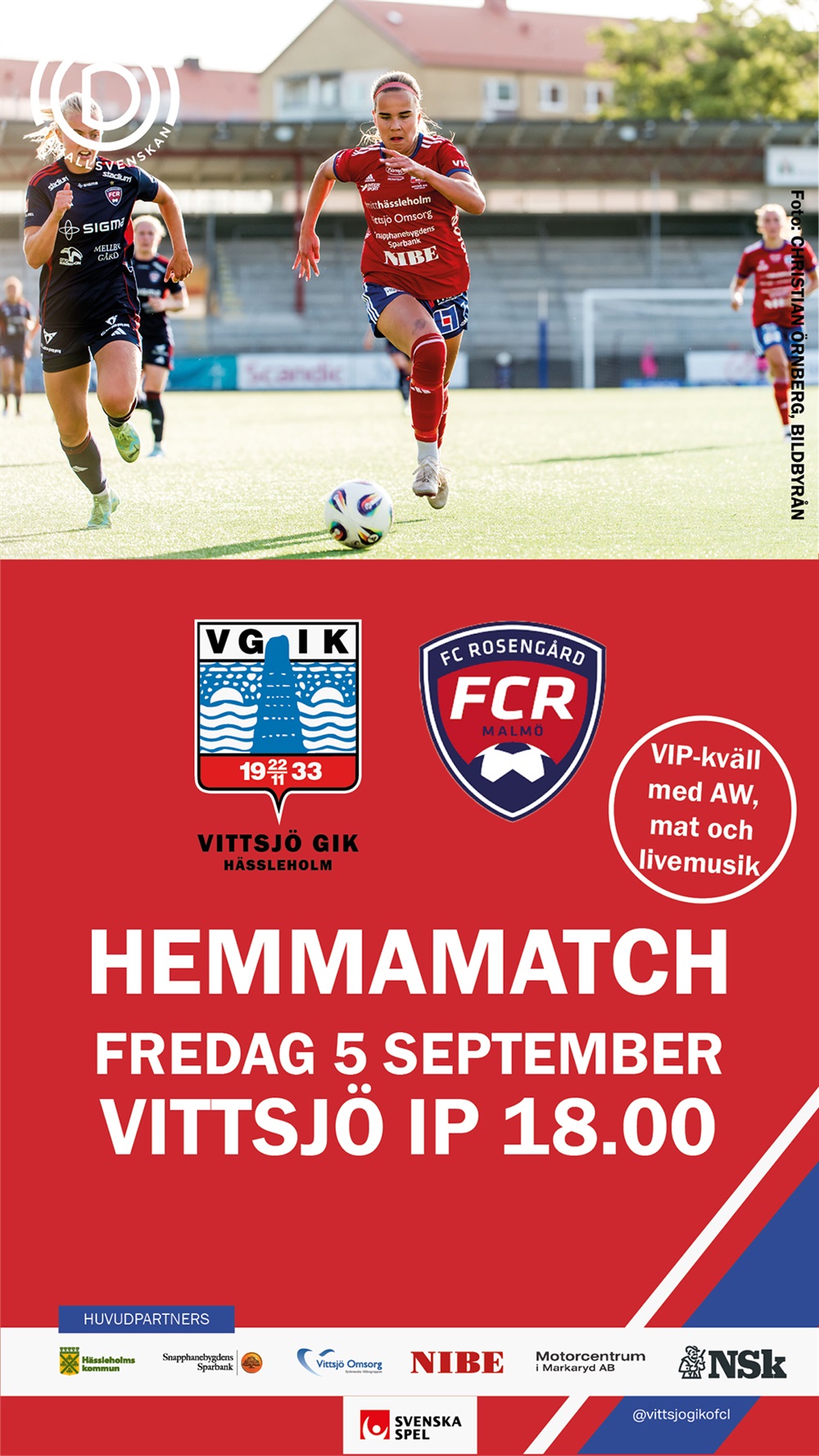 Fredagen den 5 september är det dags för en av höstens stora höjdpunkter – Skånederbyt mellan Vittsjö GIK och FC Rosengård. Vi bjuder in våra supportrar, medlemmar och volontärer till en helkväll på Vittsjö IP med After Work, livemusik och damfotboll i världsklass!