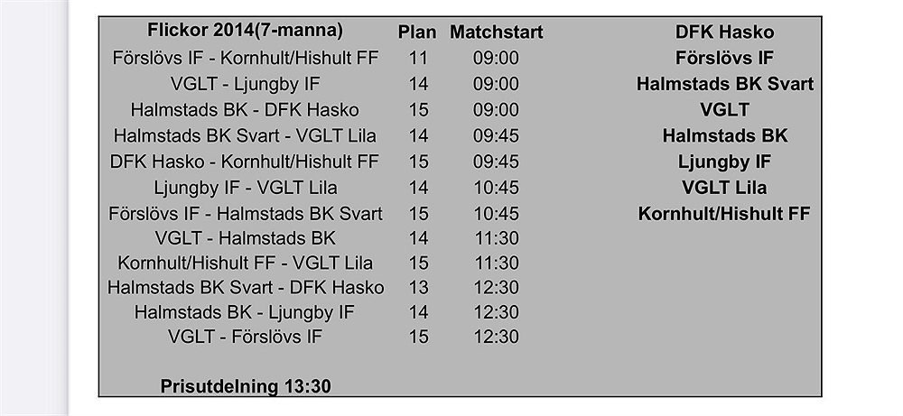 Vi har gemensam samling kl 8:15 utanför omklädningsrummen och avslutning utanför omklädningsrummen efter prisutdelningen för båda lagen. Lagen har bara en match samtidigt vilket innebär att vi alltid har den bästa hejaklacken!