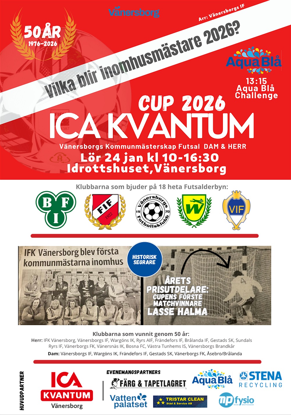 Välkommen till den 50:e upplagan av Vänersborgs Kommunmästerskap i Futsal! Vem blir 2026 års mästare på Dam- och Herrsidan detta Jubileumsår?