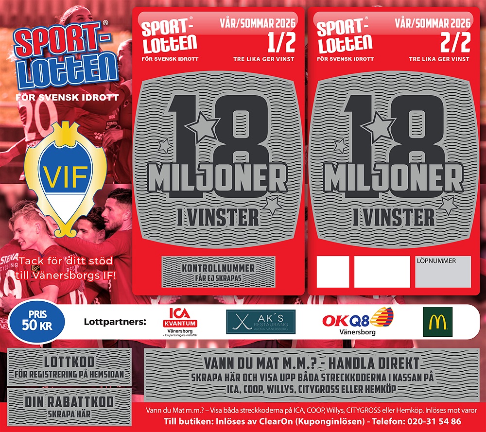 VIF Sportlotten är vår egen skraplott med chans att direkt vinna bilar, resor och kontanter. Dessutom är varje lott fylld med rabatterbjudanden från ICA Kvantum, AK ́s Restaurang, OK/Q8 och McDonalds värda sammanlagt 300 kr som gör att lottköparen vid användning av rabatterna hos våra samarbetspartners får mer än hela lottpengen tillbaka, utöver vinstchanserna. Varje lott har också en kod till ett digitalt rabatthäfte i mobilen, med fler rabatter över hela landet.