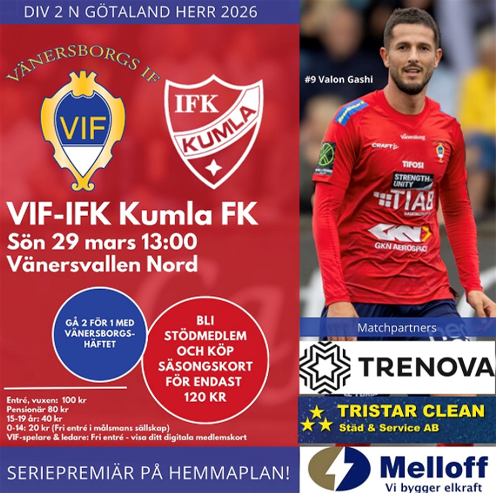 Välkommen på seriepremiären för VIF:s herrar på Vänersvallen Nord i Division 2 Norra Götaland, söndag 13:00. VIF tar emot IFK Kumla!