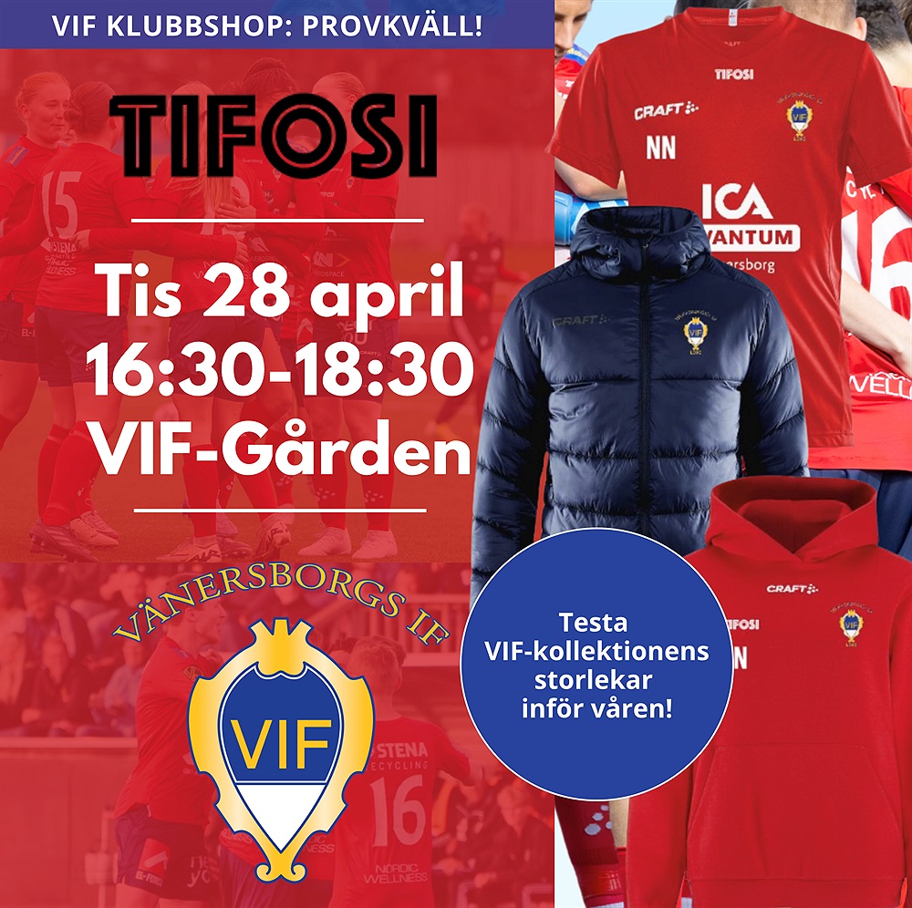 Fotbollssäsongen rullar nu igång på bred front och för att vara säker på att det blir rätt storlek på era beställningar i VIF Klubbshop inför våren så kommer vår samarbetspartner TIFOSI till VIF-gården tisdag 28 april kl 16:30-18:30 för en extra provkväll av VIF-kollektionen.