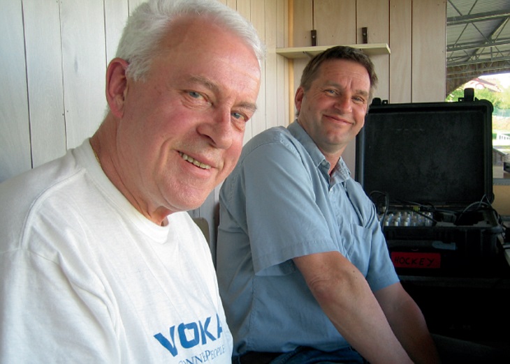 Speakerbåset på Vänersvallen var under närmare 40 år Stenåke O. Walltins andra hem. Under jubileumssäsongen 2006 tog han bland annat hand om derbyt VIF-VFK med bisittaren och dåvarande VIF-ordförande Björn Stohlt (t h).
