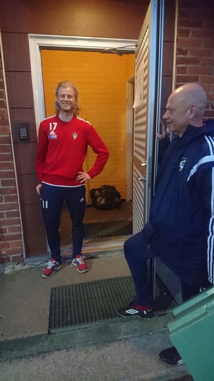 Öppnar dörren fullt ut för fotbollen! Nils Berner är tillbaka i VIF:s omklädningsrum för att stanna. Och assisterande tränaren Hans Adolfson välkomnar honom med glädje. Foto: Adam Jakobsson