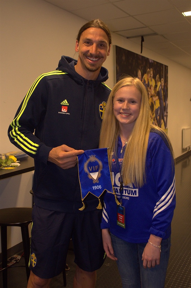 Lagkapten Zlatan verkar mycket nöjd med att äntligen kunna pryda prisskåpet med en VIF-vimpel, som Sophie Lojander överlämnade när de möttes förra veckan.