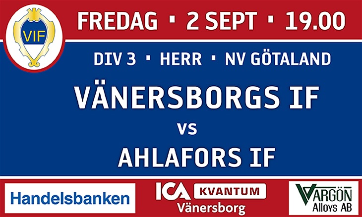 Ikväll fortsätter VIF:s herrar sitt arbete i toppen av trean. Ahlafors gästar ett VIF som leder serien med fem poäng med just fem omgångar kvar. Lägg fredagsmyset på Vänersvallen och kom och stötta laget kl 19. Bjud gärna med en kompis och används Vänersborgshäftets erbjudande: Gå 2 - Betala för 1.