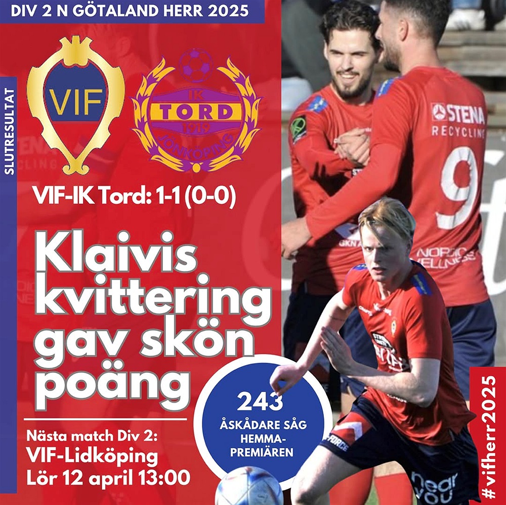 En bra rödblå start och en stark forcering. Däremellan var det ett piggt IK Tord som utmanade VIF rejält på Vänersvallen Nord i hemmapremiären i Division 2 i söndagens solsken.matchen slutade 1-1 (0-0)