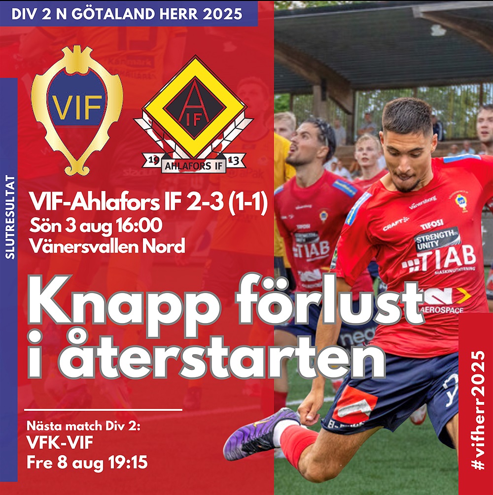 En lovande inledning och en match med två fina VIF-mål, men det blev tyvärr inga poäng i återstarten av Division 2 Norra Götaland på söndagen för herrlaget. Gästande Ahlafors vann med 2-3 (1-1) mot ett VIF som tvingats pussla om en hel del i startelvan på grund av flera varningsavstängningar.
